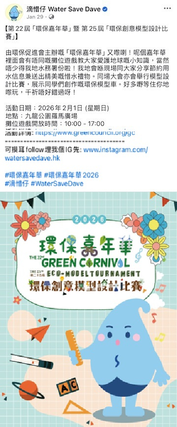 Organised by the Green Council and supported by the Water Supplies Department (WSD), the 22nd "Green Carnival" and the 25th "Eco‑Model Tournament" were held on 1 February 2026 at the Piazza of Kowloon Park, Tsim Sha Tsui. The event attracted members of the public to participate in a wide range of environmental activities, promoting environmental protection messages.