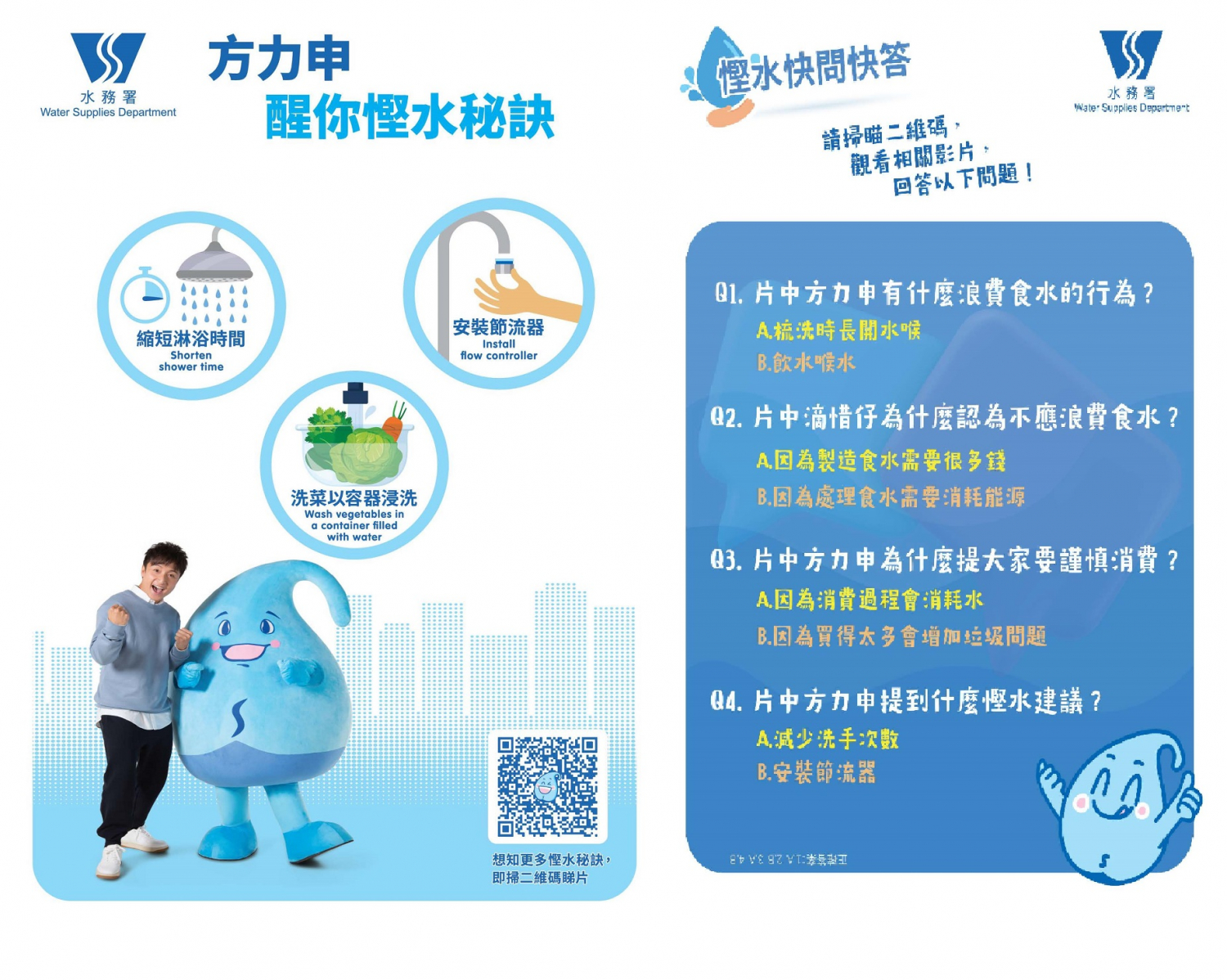 As a supporting organisation, WSD promoted the event through its social media platforms to encourage participation. On the event day, the Department's mascot, "Water Save Dave", interacted with participants to promote water conservation messages. An electronic Passbook (ePassbook) was also introduced. WSD contributed water‑saving tips and a short Q&A mini‑game, enabling participants to learn practical water‑saving knowledge through interactive means.
