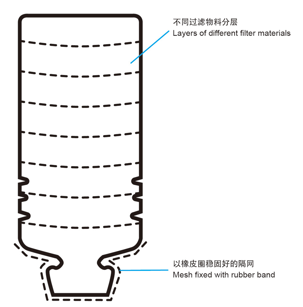 - 过滤物料:滤纸或咖啡滤纸、棉花、粗幼沙粒、大大小小的卵石、活性炭(于园艺店及水族店有售)