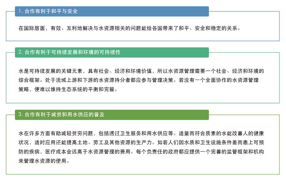 透过在水资源管理方面取得合作机会,并了解有关「水合作」的好处及所面临的挑战,能够帮助国与国之间建立互敬、互信及互相理解的关系,有利促进和平、安全以及可持续的经济增长。