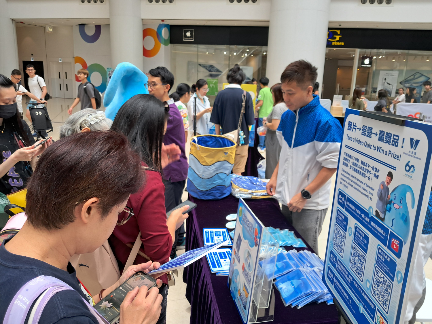 作為支持機構,水務署在現場設置攤位遊戲,分享節水信息和東江水供港歷史。水務署吉祥物滴惜仔亦到場與訪客見面留影,鼓勵大家節約用水。