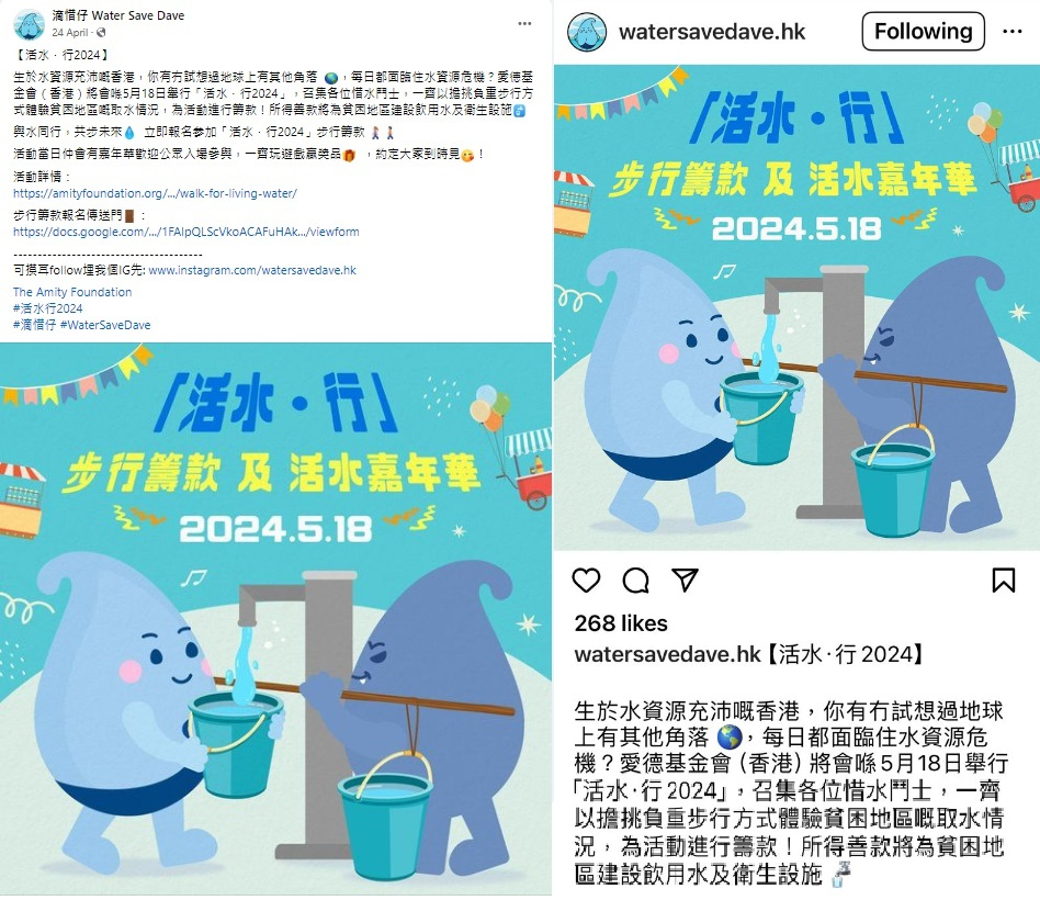 由愛德基金會主辦、水務署合辦的第14屆「活水.行」活動,已於2024年5月18日(星期六)假聖公會馬鞍山主風小學圓滿舉行。活動吸引逾300人參與,並籌得近15萬港元善款,將為東南亞貧困地區建設安全飲用水系統及衛生設施。